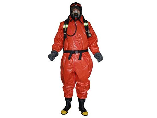 氣密重型防化服,雙面Hypalon?涂層面料(550g/m2),組件和接縫采用內(nèi)/外部雙硫化密封,帶有高氣密性密封拉鏈,高強(qiáng)度、抗沖擊、高清晰度面屏,頭部后面配置雙排氣閥門(mén)。防護(hù)時(shí)間:防較強(qiáng)滲透性溶劑(甲苯等)、強(qiáng)酸堿(96%硫酸等)或強(qiáng)穿透性毒劑(芥子氣等)的時(shí)間≥2小時(shí),防化靴防毒時(shí)間≥5小時(shí),抗多種高濃度化學(xué)試劑滲透長(zhǎng)達(dá)8小時(shí)以上,卓越的防酸堿性能,防火阻燃,耐UV/臭氧、抗曲饒龜裂、耐磨、防霧、防固體顆粒,浸水2小時(shí)以上不滲水,拉伸強(qiáng)度:徑向、緯向≥20KN/m。在-40℃~35℃范圍內(nèi)可正常使用,保證穿著者的舒適及安全。